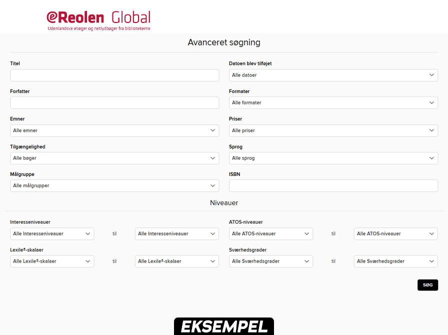Der kan søges på indhold - enkelt og avanceret - og der kan græsses igennem det spændende indhold på de digitale boghylder.